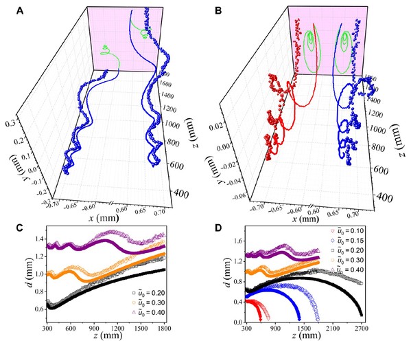 图1:自由空间中PPVPBs的涡旋轨迹与涡旋间距变化。(A和B)相对离轴距离ũ₀=0.4时,不同拓扑荷下的涡旋轨迹图,其中(A)m₁ = m₂ = 1,(B)m₁ = -m₂ = 1。图中蓝色与红色点分别表示正涡旋与负涡旋的实验运动轨迹,实线为理论预测结果,绿色线为其在xy平面上的投影。(C和D)在不同ũ₀下,涡旋间距的传输演化过程,其中(C)m₁ = m₂ = 1,(D)m₁ = -m₂ = 1。