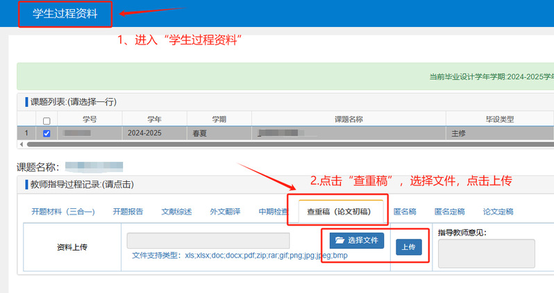 步骤1:登录教务系统(zdbk.zju.edu.cn),进入毕业论文(设计)——学生过程资料,在“查重稿(论文初稿)”处上传需要查重的稿件;