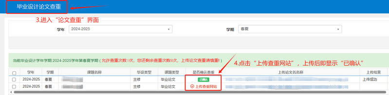 1.原则上,每位学生在教务系统只能点击1次“上传查重网站”进行检测,请勿上传无关内容进行检测。