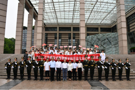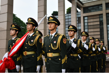 活动结束后,参与升旗仪式的学院领导、师生与国旗仪仗队队员合影留念。