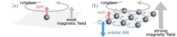 Image title: Spin versus orbital polarization under an external rotation field with varying magnetic field strength