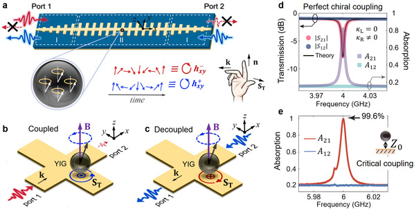 图1. 自旋-动量锁定波导磁振子系统中的手性耦合及单向完美吸收