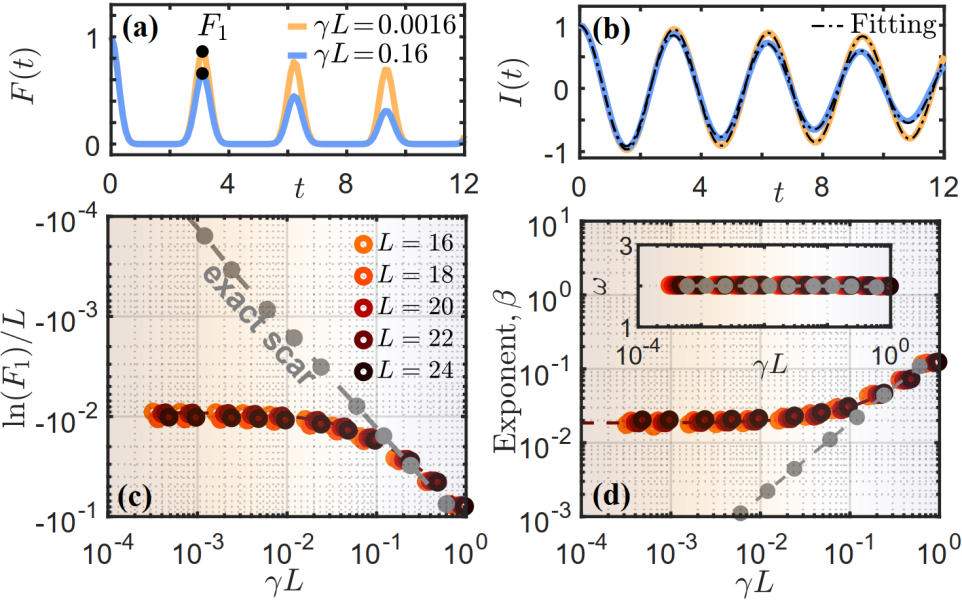 为验证谱转变对量子动力学的影响,研究团队开展了系统的动力学演化模拟。结果显示:在谱转变发生前,近似疤痕态的关键动力学特征—— 包括保真度峰值、密度失衡振荡等 —— 能够保持稳定;而当退相干强度超过临界值、谱转变发生后,这些非热化动力学特征迅速衰减至热平衡值,表现为普通的指数衰减行为。这一现象既延续了封闭系统中疤痕态的鲁棒性特征,又明确了量子噪声在调控这一稳定性中的关键作用,为谱转变机制提供了直接的动力学证据(图 3)。
