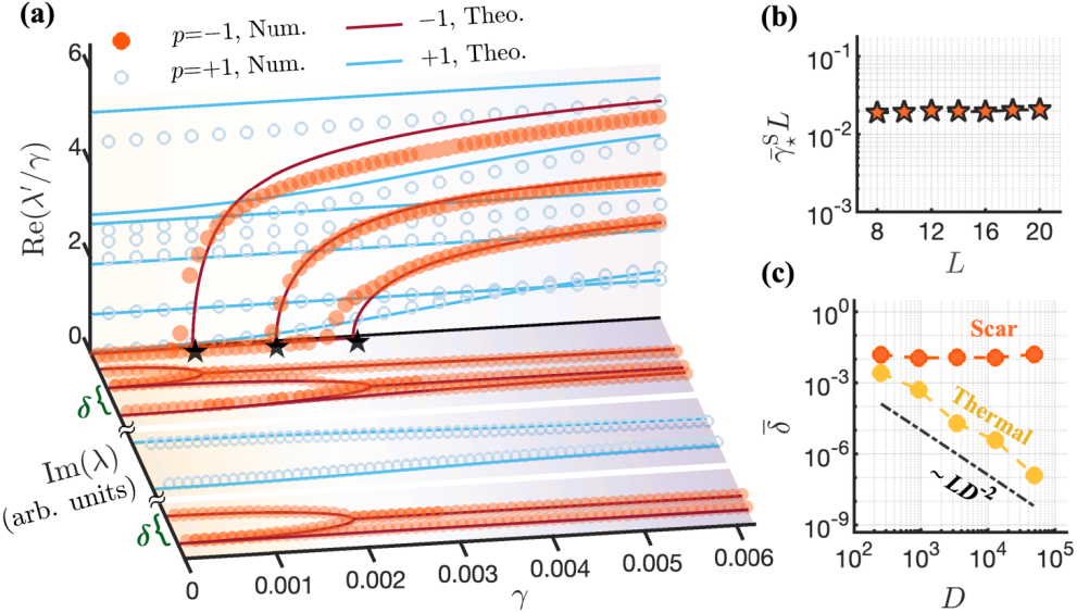 对于一般的量子多体遍历系统,这个典型的转变值随系统规模呈指数衰减,意味着大型系统对噪声极其敏感。而疤痕本征模式展现出完全不同的行为:其谱转变值只与系统尺寸成反比,如图 2b–2c所示。这意味着即使系统扩大 10 倍,维持疤痕态相干性所需的噪声控制精度只需提升一个量级,而非指数级,这在实际系统中更容易实现。