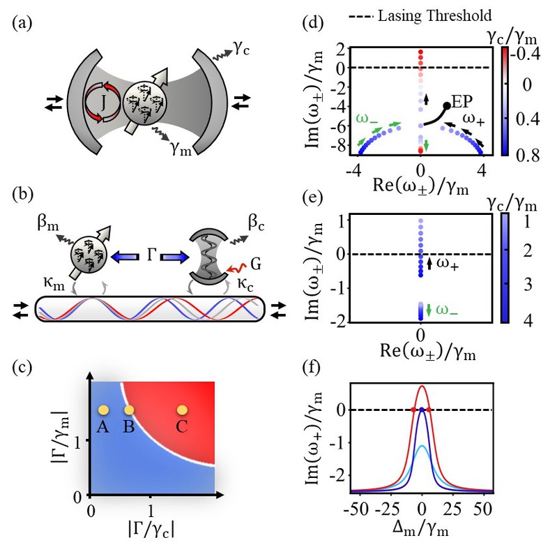 从系统的本征行为来看,耗散耦合系统激光的阈值条件对应于系统协同率为1。然而,由于耗散耦合源于模式间的协同耗散,其耦合强度与模式耗散存在固有的依赖关系,致使系统的协同率难以达到甚至超过1。因此,过去对耗散耦合的实验研究往往局限在弱耦合区域(图1(c)蓝色区域)。此外,尽管相干耦合系统中的强耦合研究已较为成熟,但关于“强耗散耦合”的探索仍然不足,亟需进一步研究其在光-物质相互作用中的意义与应用潜力。
