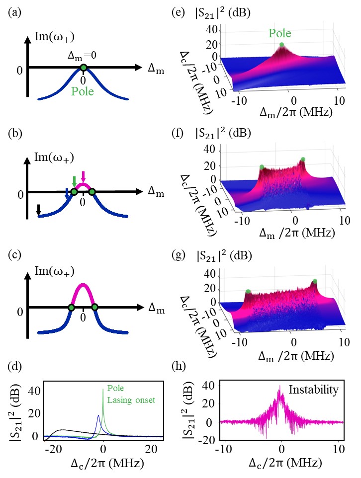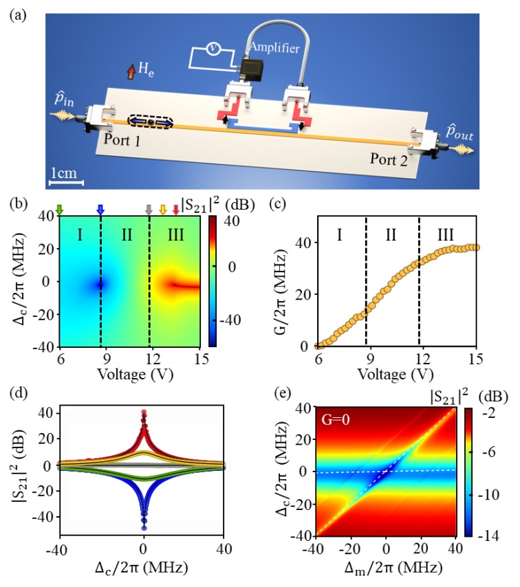 如图2(a)所示,将嵌有放大器的正反馈微波电路(红色部分)与微波腔(蓝色部分)耦合,腔光子模式的耗散可随放大器偏置电压的改变连续被补偿。这一过程清晰反映在传输谱中,如图2(b)和(d)所示。通过拟合传输谱线,我们发现该反馈电路可最终将腔光子模式补偿至0线宽,且在此过程中腔模的谐振频率和向波导的辐射耦合强度基本保持不变。此时将YIG小球放置在波导上,微波腔模与磁振子模式会通过行波媒介间接地发生相互作用。二者之间的相互作用类型可以通过改变YIG小球与平面谐振腔的相对位置来改变。如图2(e)所示,谱线在磁场变化下呈现的能级吸引特性确定了耗散耦合的建立。该谱线是在无正反馈电路偏置电压下测得的,此时该系统的协同率小于1(对应于图1(c)中的A点),因此无法产生极化激元激光。反馈电路的引入可减小腔模的等效耗散,而不改变耗散耦合强度,使得该系统的协同率达到并超过1成为可能。