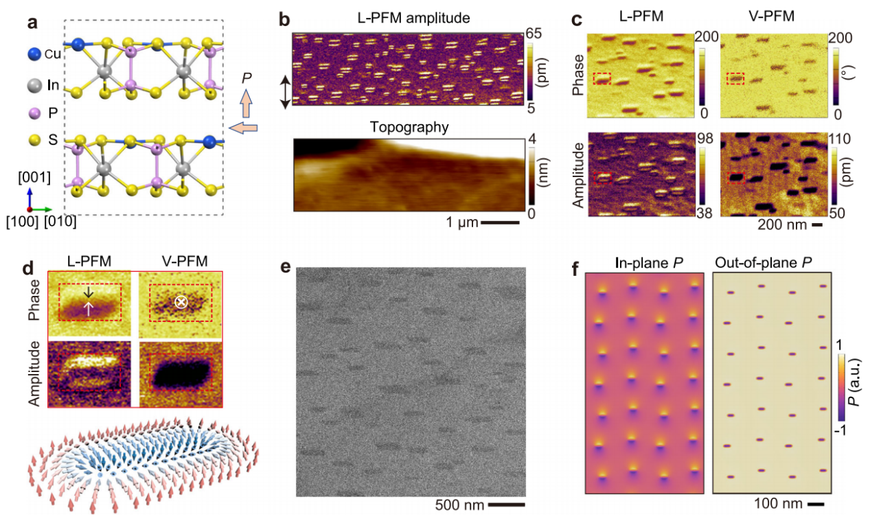 图 1 在CuInP2S6晶体中观察到拉长型的极性斯格明子。a CuInP2S6晶体结构示意图。Cu和In原子的反向位移导致了面外和面内的偶极子。b 160纳米厚的CuInP2S6晶体表面大面积的横向压电力显微镜(L-PFM)振幅和形貌图,显示出类似咖啡豆形状的极性纹理。样品沿水平方向扫描,PFM探头检测到的极化方向沿箭头(左下角)。c 在(b)中左上区域的L-PFM和垂直压电力显微镜(V-PFM)图像。d 在(c)中标记为红色的放大偶极子构型示意图绘在(d)的底部。e 用于识别斯格明子特征的环形暗场STEM图像。f 拉长型的极性斯格明子的面内和面外极化构型的相场模拟。结果与L-PFM和V-PFM响应相似。P表示标准化极化。