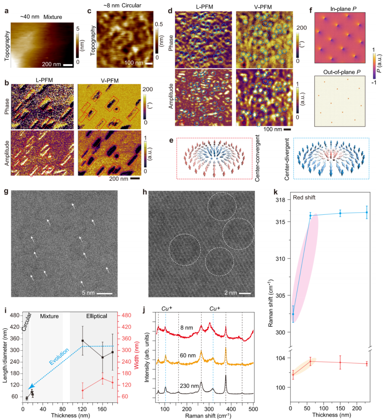图 2 随着CuInP2S6厚度减小的拓扑演化。40纳米(a和b)和8纳米(c和d)厚度CuInP2S6的形貌图、V-PFM和L-PFM图像。在(b)中,拉长型的和圆形的极性斯格明子都具有中心汇聚的螺旋性。在(d)中,大多数圆形极性斯格明子表现出中心发散特性,而只有一个(如红色标记所示)被识别为中心汇聚型。e、中心汇聚和中心发散的圆形斯格明子的示意图。f、模拟的圆形极性斯格明子的极化构型。g、低放大倍数的STEM映射,显示了许多圆形特征,用白色箭头标记。h、具有斯格明子晶格的原子分辨率STEM映射。白色虚线表示典型的斯格明子。i、统计斯格明子尺寸与样品厚度的关系。数据提取自PFM振幅图像。j、厚度依赖的拉曼光谱。铜振动峰用蓝色虚线标记。k、与铜振动峰厚度减小相关的拉曼位移统计。i和k中的误差条表示标准偏差。