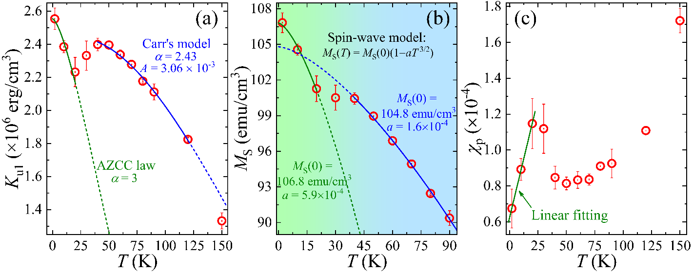 这其中单轴磁晶各向异性的温度依赖更是实现超高密度磁存储介质、理解磁斯格明子复杂相图以及优化自旋电子学器件的关键课题。对于绝大多数铁磁体,表征单轴磁晶各向异性温度依赖的Ku1(T)通常多符合经典的Akulov-Zener-Callen-Callen (AZCC)指数律,这种AZCC型Ku1(T)随温度的上升会表现出快速下降的趋势,极少数铁磁体如三维Fe3GeTe2块材中存在的遵循Carr模型的反常Ku1(T) [汤怒江等,Phys. Rev. B 109, L060404 (2024)]。