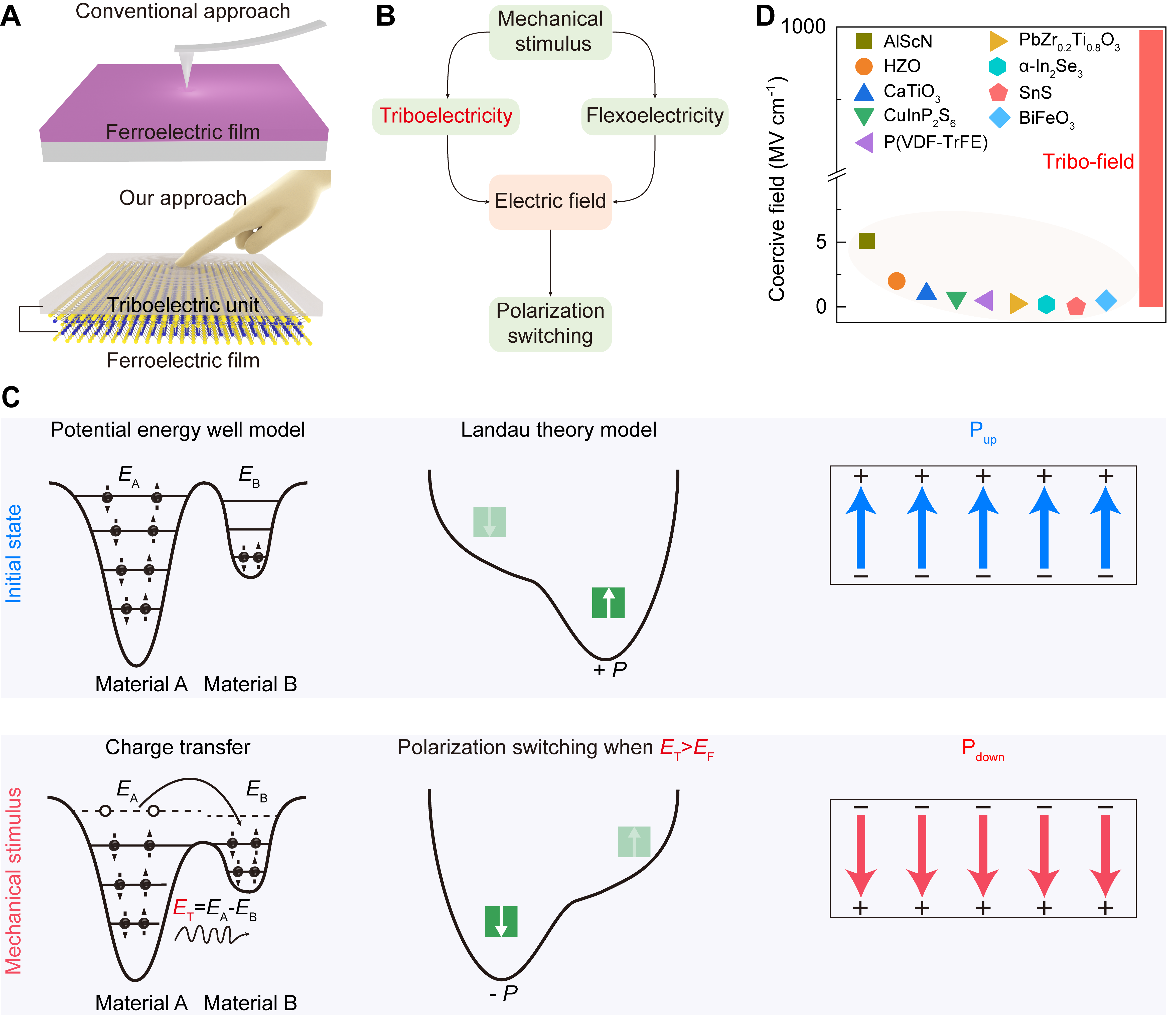在铁电材料体系中,机械应力诱导铁电极化翻转通常依赖于挠曲电效应机制。通过非均匀应力场产生的梯度电场驱动电极化反转,然而其实际应用面临显著挑战:需借助原子力显微镜探针在纳米级接触区域施加GPa的超高机械应力,这严重限制了其在触觉传感和存储器件等领域的实际应用。突破这一技术瓶颈的关键在于开发新型低压强驱动策略,甚至实现触摸量级机械应力下的极化调控。摩擦电效应展现出了独特优势——该效应通过界面接触带电与静电感应耦合作用,能在千帕级压强下产生数百伏量级的高压输出,为低功耗铁电极化翻转提供了极具潜力的技术路径。近日,pp电子游戏平台官网量子物态与器件研究中心薛飞研究员、常凯院士团队创新地使用摩擦电效应,突破该领域的巨大压强瓶颈,实现超低压强的机械活动调控铁电极化,为构建高灵敏度、低功耗的类触觉系统提供了全新思路。