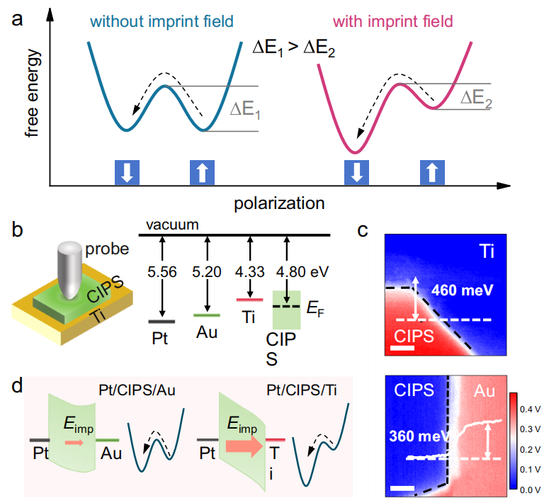 图 1a通过诱导压印场来减少柔性电切换力的策略。b CIPS放置在钛上的示意图,顶部扫描铂探针施加机械力。能量图展示了Pt、CIPS和Ti(金)之间能级的对齐情况。c分别为CIPS在钛和金上的开尔文探针力显微镜表面势图像。d能带图展示了Pt/CIPS/Ti结构中的显著压印场,以及与Pt/CIPS/Au结构相比,CIPS中极化切换的能量势垒更低。