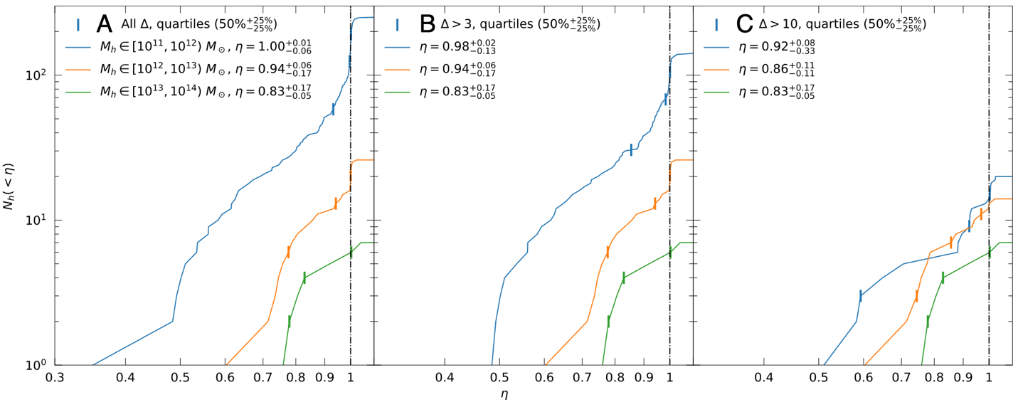 图二:η为同一个星系在有无射电瓣的两种情形下重子物质在星系总质量中占比的比值。A-C分别显示了不同的环境平均密度Δ中,不同抑制程度参数η对应星系数量的累积值。