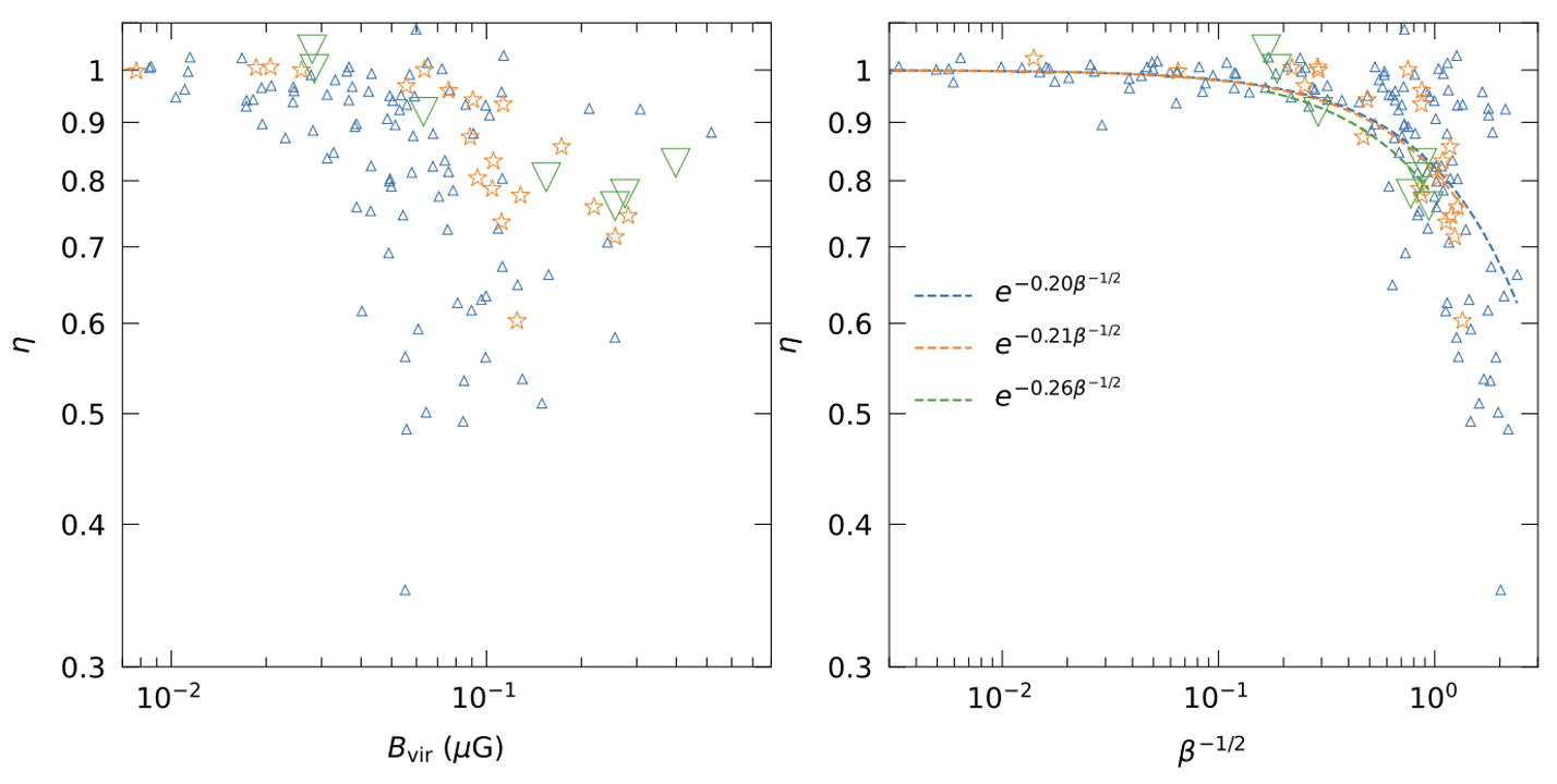图三:重子抑制程度参数η与星系边界磁感应强度Bvir(左图)、磁流体β参数(右图)的关系。