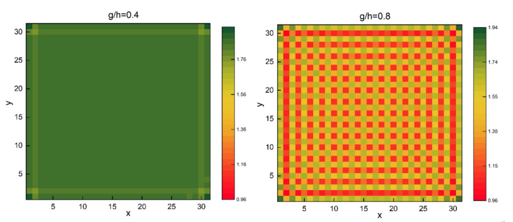图1:价键固体的局域序参量在32x32体系上的分布。左图代表退禁闭相,右图代表禁闭相。