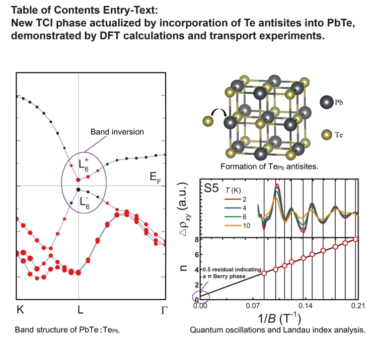 Recently, the collaboration of two research groups in Department of Physics (Prof. Huizhen Wu and Prof Huiqiu Yuan) and Dr. Yunhao Lu in School of Materials Science and Engineering of Zhejiang University led to the realization of a new PbTe TCI. Mr. Songsong Ma and Mr. Chunyu Guo are co-first authors. They theoretically predicted that Te antisite defects change the band order of PbTe and there exist topological surface states on high symmetry crystal surfaces. Experimentally, they synthesized Te-antisite-doped [111]-oriented PbTe films using molecular beam epitaxy technology and conducted quantum transport experiments on the samples at low temperatures and high magnetic fields. The observed quantum oscillations reveal a nontrivial Berry phase in PbTe: TePb, which demonstrates the Dirac fermion nature of the topological surface states. Further experiments on PbTe: TePb upon applying external pressure up to 2.2 GPa show that pressure can enlarge the inverted gap and reduce the bulk carrier contribution to the quantum transport. The intrinsic defect engineering approach developed in this work could be applied to other materials, especially to chalcogenides, which provides the opportunity to discover more topological materials. This work is published in Advanced Functional Materials (DOI: 10.1002/adfm.201803188).