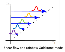 We study an OðNÞ scalar model under shear flow and its Nambu-Goldstone modes associated with spontaneous symmetry breaking OðNÞ → OðN − 1Þ. We find that the Nambu-Goldstone mode splits into an infinite number of gapless modes, which we call the rainbow Nambu-Goldstone modes. They have different group velocities and the fractional dispersion relation ω ∼ k2=3 1 , where k1 is the wave number along the flow. Such behaviors do not have counterparts in an equilibrium state.