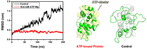 Recent experiments suggested that ATP can effectively stabilize protein structure and inhibit protein aggregation when its concentration is less than 10 mM, which is significantly lower than cosolvent concentrations required in conventional mechanisms. The ultrahigh efficiency of ATP suggests a unique mechanism that is fundamentally different from previous models of cosolvents. In this work, we used molecular dynamics simulation and experiments to study the interactions of ATPs with three proteins: lysozyme, ubiquitin, and malate dehydrogenase. ATP tends to bind to the surface regions with high flexibility and high degree of hydration. These regions are also vulnerable to thermal perturbations. The bound ATPs further assemble into ATP clusters mediated by Mg2+ and Na+ ions. More interestingly, in Mg2+-free ATP solution, Na+ at higher concentration (150 mM under physiological conditions) can similarly mediate the formation of the ATP cluster on protein. The ATP cluster can effectively reduce the fluctuations of the vulnerable region and thus stabilize the protein against thermal perturbations. Both ATP binding and the considerable improvement of thermal stability of ATP-bound protein were verified by experiments.