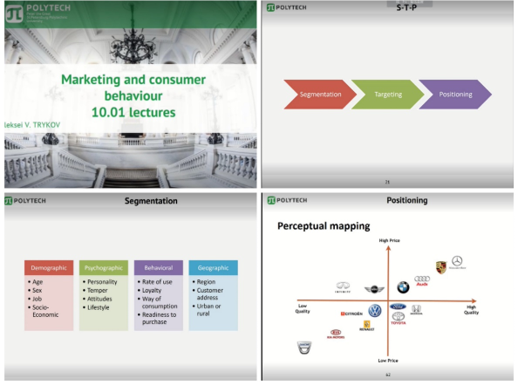 In the Marketing and consumer behavior module, the teacher introduced the most basic definition, guided students to think about the meaning of marketing and consumer behavior in real life, and further enhanced the understanding of the concept through introducing the development of the Russian market. In the process of explanation, the teacher showed the whole process of market analysis in detail from the three steps of Segmentation, Targeting and Positioning. The interesting and clear structure demonstration made the obscure and dull knowledge lively. The students also mastered the relevant skills in a relaxed and happy atmosphere. In the final course presentation session, the students put what they have learned into practice and completed the task of product analysis excellently. The combination of learning knowledge and cooperative practice makes this learning experience more unique and meaningful.