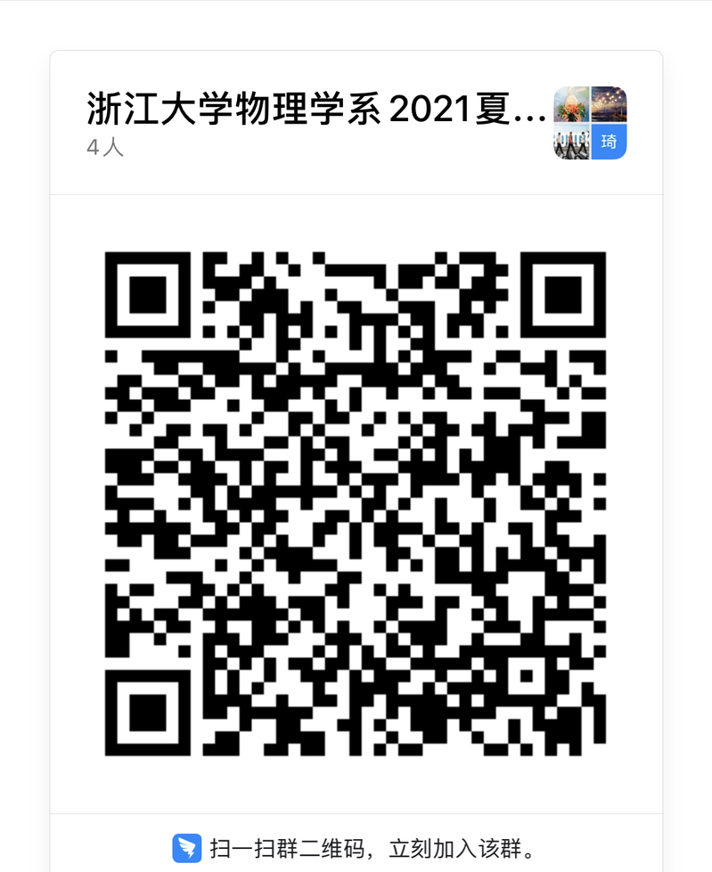pp电子游戏平台官网物理学系定于2021年5月9-6月26日开展全国优秀大学生物理夏令营预报名及宣传月活动。本次活动旨在给优秀大学生提供一个学术互动和交流学习的平台,加强浙大物理系与国内高水平大学相关院系的交流和联系,使更多的学生能够进一步认识浙大、了解浙大。宣传月活动主要安排在线上进行。相关的安排公告如下: 一、 申请资格1、物理及相关专业本科三年级学生(2022年6月毕业);2、学习成绩优秀,预期可获得母校推免名额。3、对物理专业有浓厚兴趣,并有较强的或潜在的研究能力; 二、 活动形式pp电子游戏平台官网物理学系将以钉钉为平台,进行一系列线上学术报告、专业介绍、实验室介绍等活动。 三、预报名方式钉钉扫描二维码,备注“姓名+学校+学号+手机号”申请入群(入群后请实名,选拔夏令营正式营员时将会核对个人信息):夏令营申请方式、活动安排、考核及优秀营员选拔方案将会在群里发布。敬请关注! 四、联系人:郑老师;Email:phyzll@zju.edu.cn; 电话:0571-87953304马同学:21936032@zju.edu.cn徐同学:11936015@zju.edu.cn有疑问也可以咨询钉钉群管理员!pp电子游戏平台官网物理学系2021年4月30日