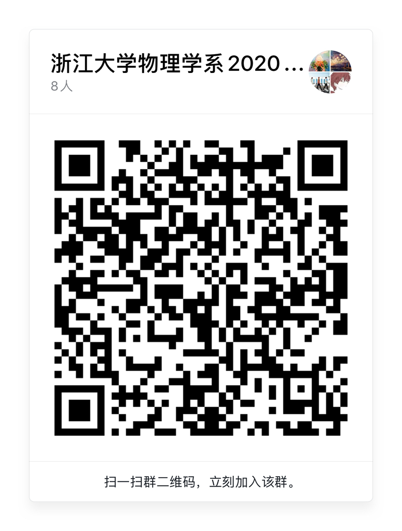 pp电子游戏平台官网物理学系定于2020年5月21-6月21日开展全国优秀大学生物理夏令营预报名及宣传月活动。本次活动旨在给优秀大学生提供一个学术互动和交流学习的平台,加强浙大物理系与国内高水平大学相关院系的交流和联系,使更多的学生能够进一步认识浙大、了解浙大。受疫情影响,主要活动将安排在线上进行。相关的安排公告如下: 一、 申请资格1、物理及相关专业本科三年级学生(2021年6月毕业);2、学习成绩优秀,预期可获得母校推免名额。3、对物理专业有浓厚兴趣,并有较强的或潜在的研究能力; 二、 活动形式pp电子游戏平台官网物理学系将以钉钉为平台,进行一系列线上学术报告、专业介绍、实验室介绍等活动。 三、预报名方式钉钉扫描二维码,备注“姓名+学校+学号+手机号”申请入群(入群后请实名,选拔夏令营正式营员时将会核对个人信息):夏令营申请方式、活动安排、考核及优秀营员选拔方案将会在群里发布。夏令营正式选拔工作将通过该钉钉群的部分功能!!敬请关注! 四、联系人: 郑老师;Email:phyzll@zju.edu.cn; 电话:0571-87953304 马同学:21936032@zju.edu.cn 徐同学:11936015@zju.edu.cn 有疑问也可以咨询钉钉群管理员!pp电子游戏平台官网物理学系2020年5月20日